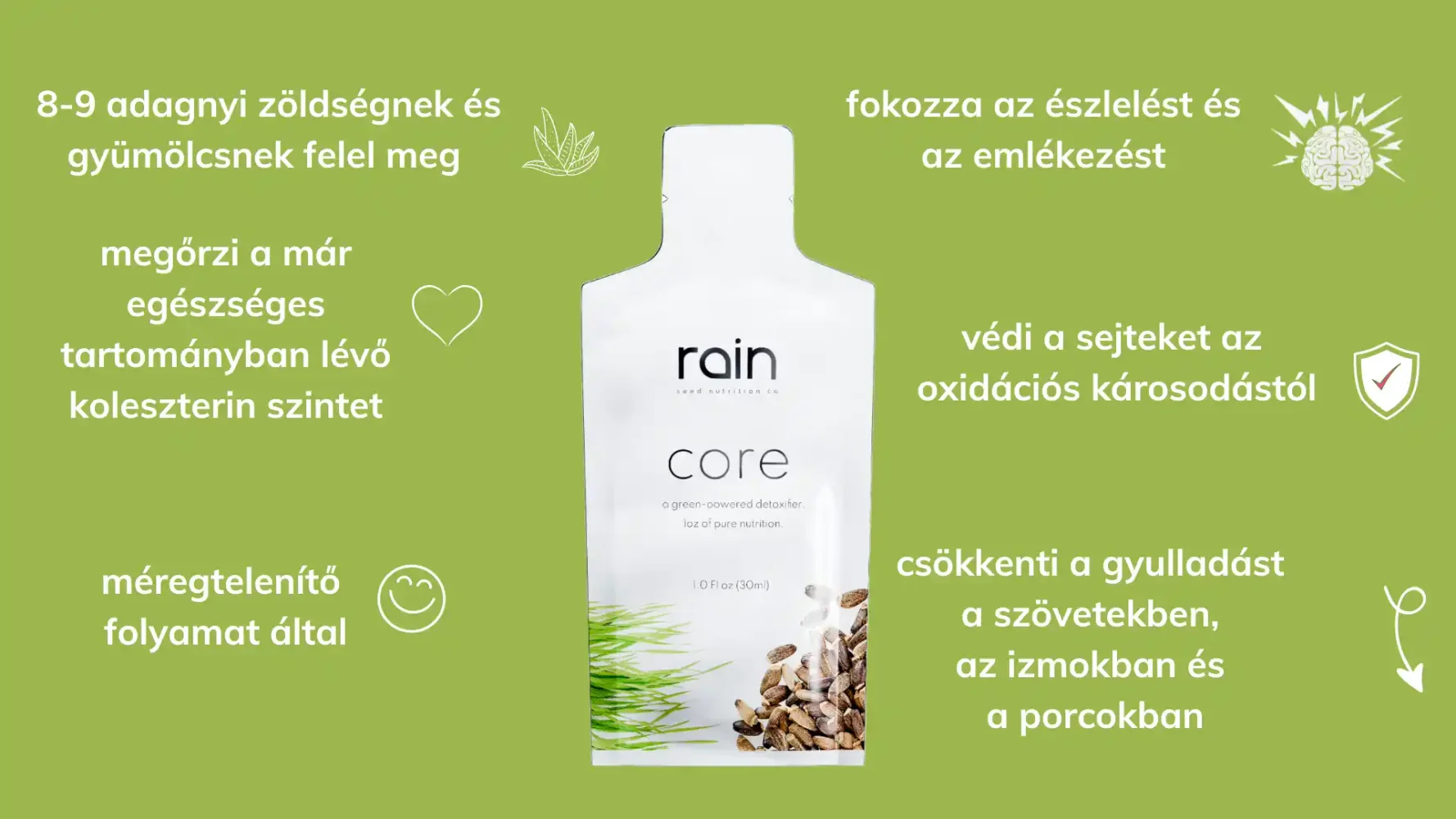 Ezáltal a mai tartósítószerekkel, mesterséges és genetikailag módosított élelmiszerekkel teli világunkban üdítő tápanyagforrást jelenthet a rain CORE termék a szervezetünk számára.